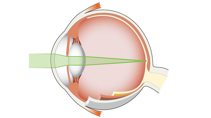 Vid normal syn bryts ljusstrålarna till en punkt på näthinnan.